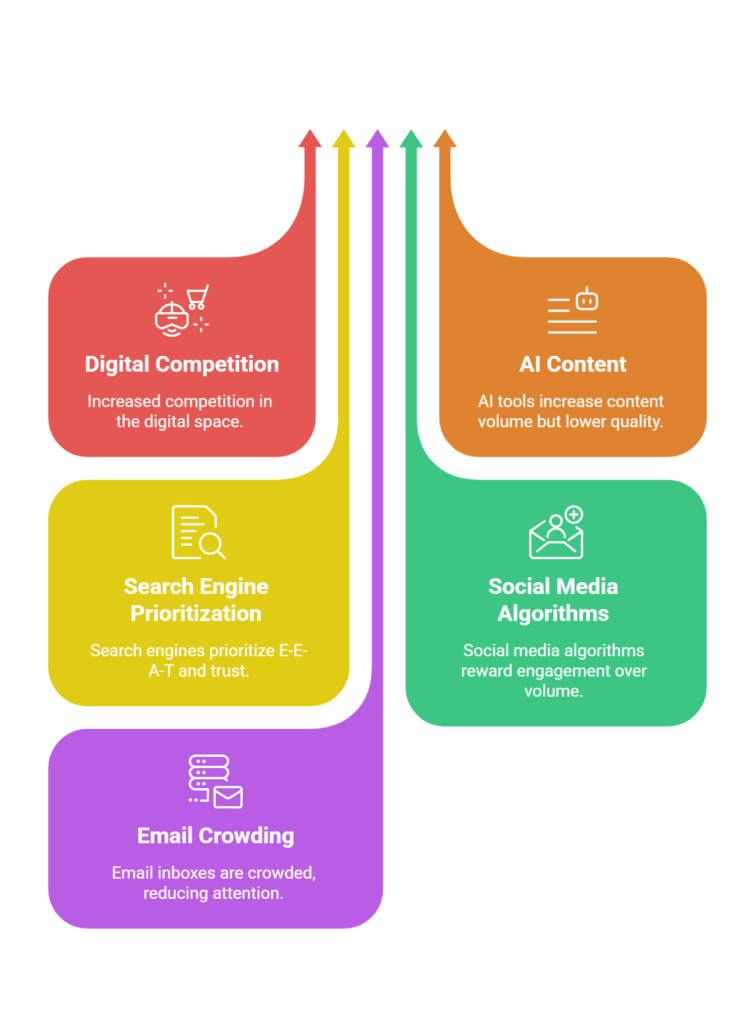 Search engines now prioritize experience, expertise, authority, and trust. Social media algorithms reward consistency and meaningful engagement over volume. Email inboxes are crowded, and attention spans are shorter.