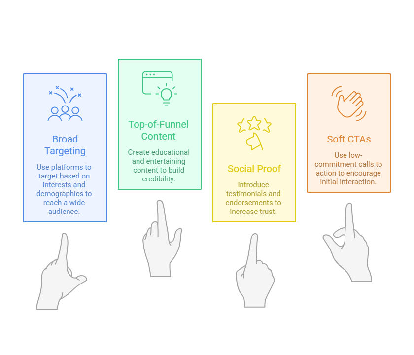 To reach individuals unfamiliar with your brand, adopt strategies that generate broad awareness without overwhelming them. Some high-impact tactics include: